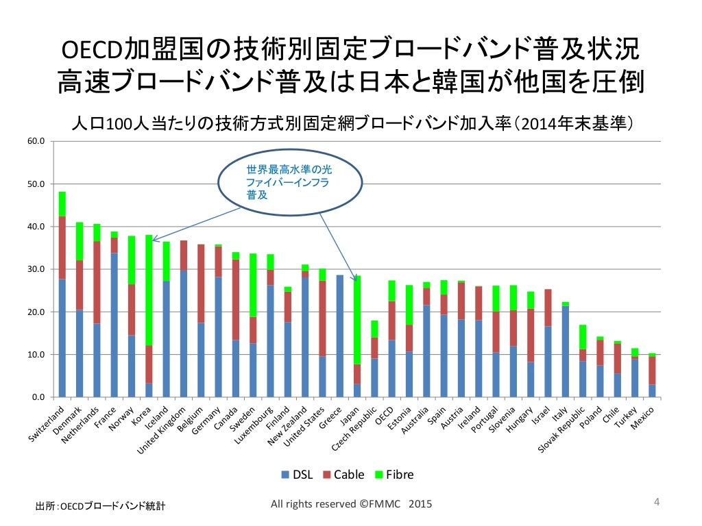 ・高速ブロードバンドの普及率で韓国と日本は他国を大きく凌駕している。