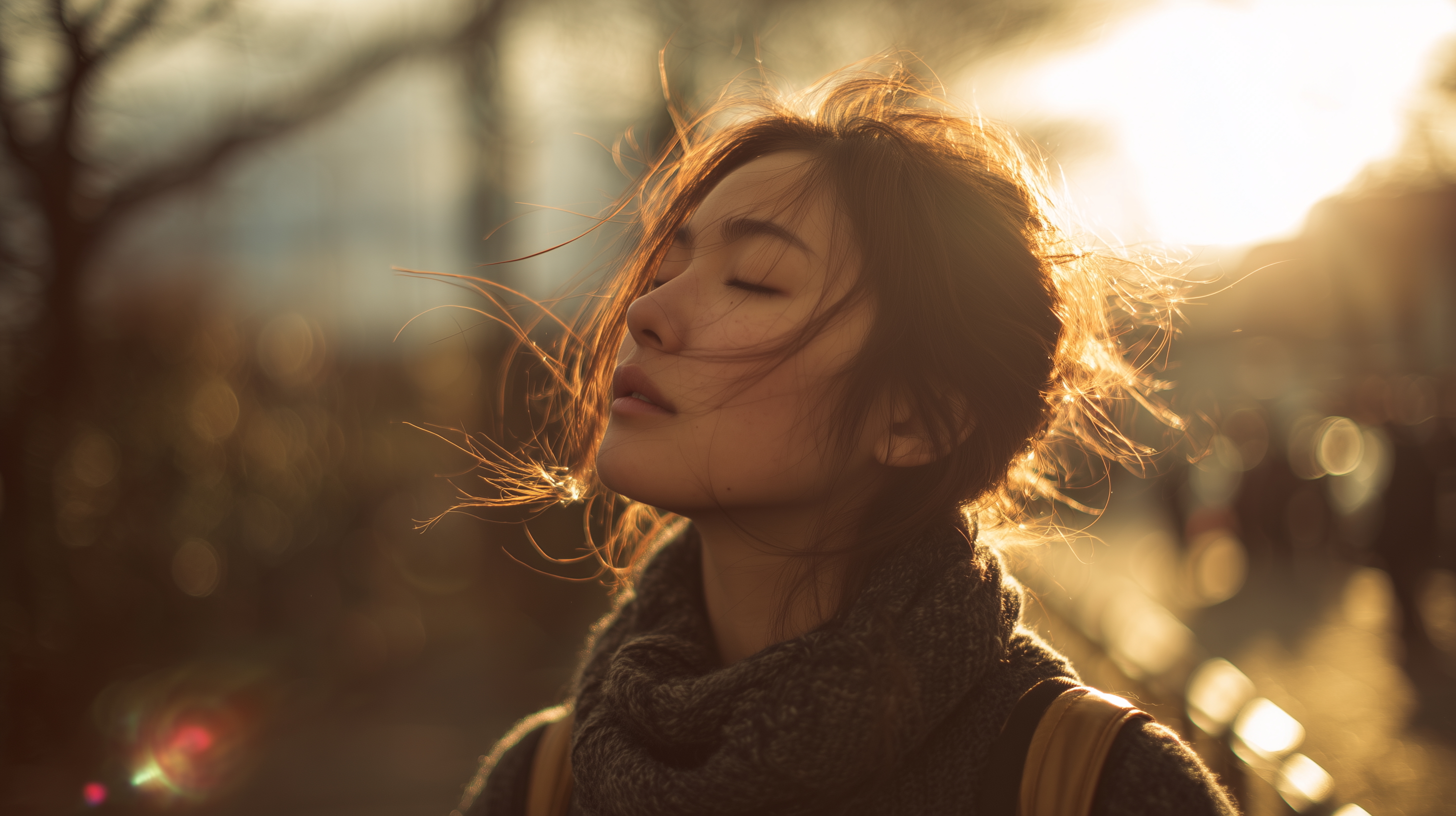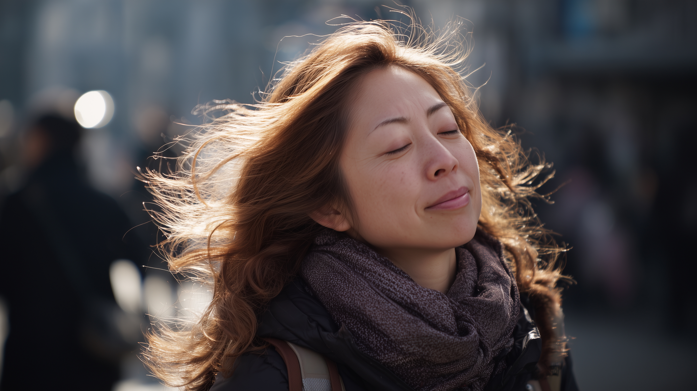 ・Prompt: a chilly afternoon breeze brushing the cheeks of a young Japanese woman (Midjourney)