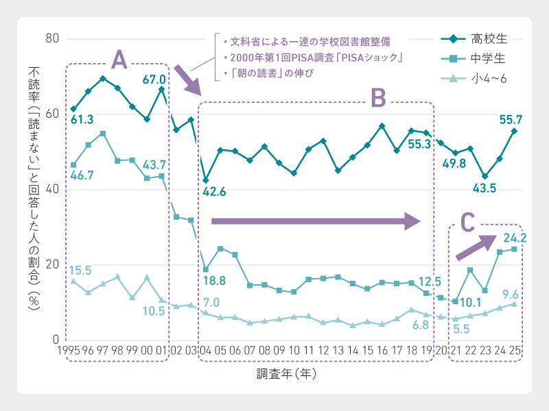 1995~2001年の頃に比べ、2004~2019年ころまでは、不読率は低下したものの、足下までの2021~2024年までの期間には悪化傾向が如実。