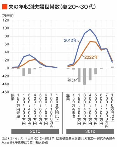 「20代では400万未満、30代では600万未満の年収帯(その年代の中間層)だけが減少していて、むしろ夫の年収上位層に限れば、これだけ全体の婚姻が減少している中でもまったく減ってはいません。