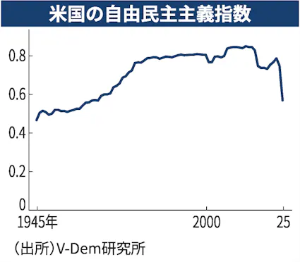 かつて米国は「世界の警察官」を自任し、自由民主主義の旗手として世界をリードしてきました。しかし今、その足元が大きく揺らいでいます。国際的な調査によれば、米国は「自由民主主義」の定義から外れるほど報道の自由が低下し、民主主義ランキングも下落し続けています。