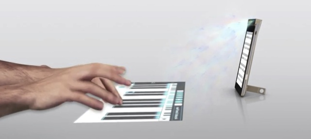 さらにユニークなのは、キックスタンドを出してスマートフォンを立てて置き、ピコプロジェクターを回転させて手前に投影すると、レーザーキーボードやピアノの鍵盤などなど、手の動きを認識する各種入力インターフェースとしても活用可能。