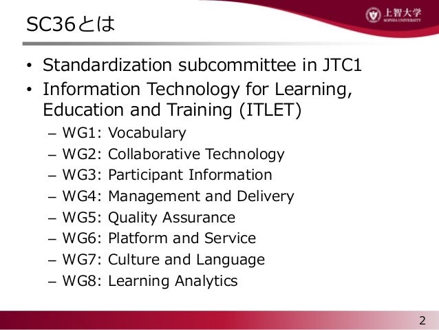 分野毎に37個のSubcommittee (SC) に分かれており、その中でSC36は「学習、教育、研修のための情報技術=Information technology for learning, education and training」を担当している。
