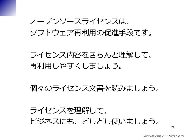 ●オープンソースライセンスの基礎と実務 http://www.slideshare.net/YutakaKachi/ss-8616029