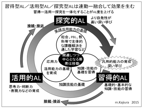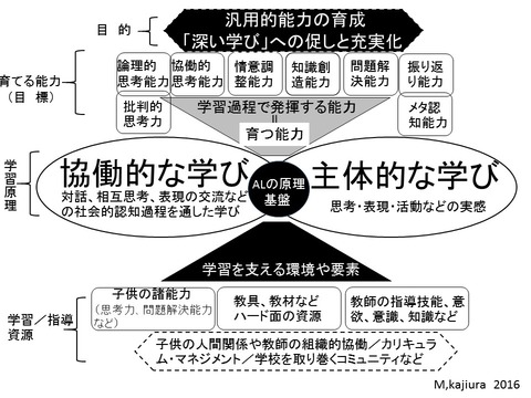 同時に、見えにくい育ちを可視化する、Make learning visible(MLV)という視点からの評価実践が不可欠。これがあってはじめて、習得的AL-活用的AL-探究的ALのそれぞれを、結び付け、つなぎ込んでいくことができる。この点で、小学校における授業のAL化は大学のレベルとは異なるといえる。