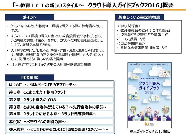 ●「教育ICTの新しいスタイル クラウド導入ガイドブック2016」の公表 http://www.soumu.go.jp/menu_news/s-news/01ryutsu05_02000076.html