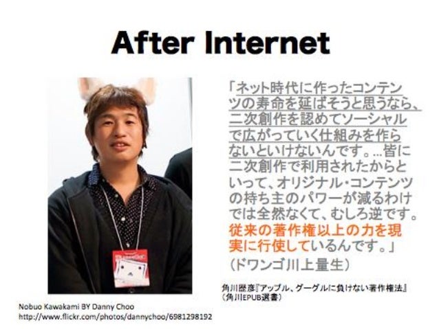 ドワンゴの川上量生氏の次の発言は著作権の体系とクリエイティブ・コモンズの思想との関係を的確に表現している。