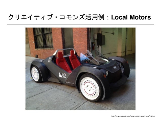 ハード面ではたとえば、半導体基板の「Arduino」や、設計図にクリエイティブ・コモンズ・ライセンスが付与され、3Dプリンティングを活用した地域地域の実情にフィットさせた「Local Motors」で活用されるなどの事例が出てきている。