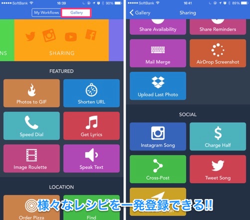 複雑な操作を自動化してワンタップで実行できるアプリ。自前で、自動プロセスを設計してしまえる(「レシピ」と呼ばれる)のが特徴だが。同時に、他のユーザーが既に作った「レシピ」をいただいてしまうこともできる(メイン画面右上の「Gallery」)。