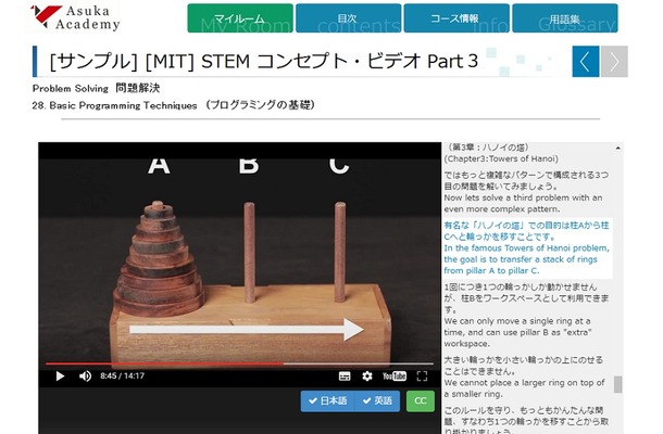 「各動画とも15分前後とコンパクトで、電子黒板での活用や反転学習教材としても利用できる。また、動画と同期した日本語字幕・英語字幕も見ることができるので語学教材にもなる」。