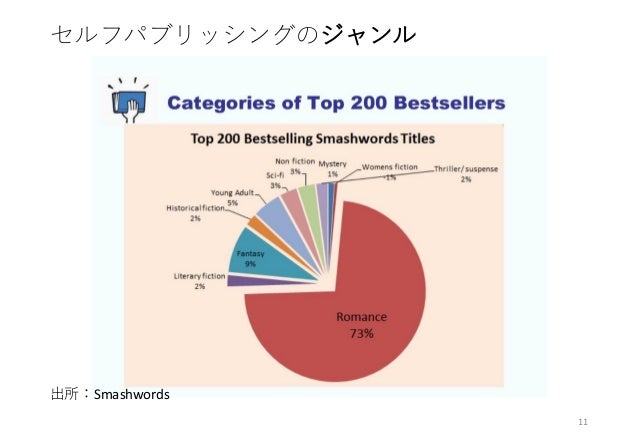 これに加え、別の「統計(※)」で電子書籍全体を観ると、セルフパブリッシングが米国の電子書籍市場の成長を支えていることがわかる。そのセルフパブリッシングの中でのジャンルで、突出しているのは「ロマンス」。(Author Earnings(http://authorearnings.com/)による「統計」)
