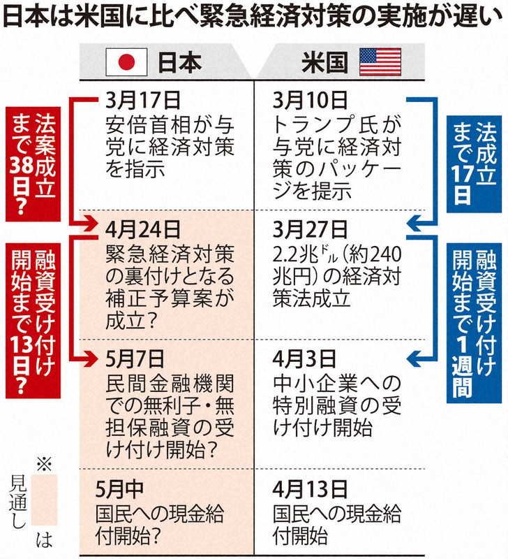 「収入が減った対象者からは「手元にお金が届くのが遅い」と不満が噴き出している。米国では既に届き始めたのに、なぜ日本は遅いのか。」