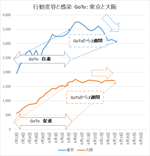 7月の四連休のころといえば、「GoToトラベル」キャンペーンによる行動変容がありました。ただしこのとき、東京はキャンペーンの対象から外れ、かつ都知事も「自粛」要請を都民に出していました。かたや大阪府知事は、行動の「自粛」要請はしないと言明していました。