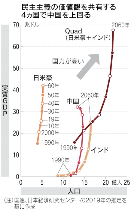 参加四か国は、民主主義などの価値観を共有しています。連携を強めることで、インド太平洋地域で存在感を高め、攻勢を強める中国の行動を押さえ込むには、「国力の方程式」の基本的要素、人口で対抗するのには十分な意味があると理解されるのです。